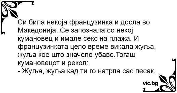 Си била некоја французинка и досла во Македонија. Се запознала со некој кумановец и имале cekc на плажа. И французинката цело време викала жуља, жуља кое што значело убаво.Тогаш кумановецот и рекол: