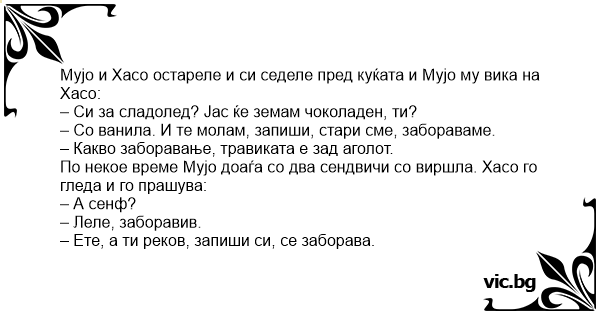 Мујо и Хасо остареле и си седеле пред куќата и Мујо му вика на Хасо: