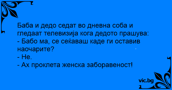 Баба и дедо седат во дневна соба и гледаат телевизија кога дедото прашува: