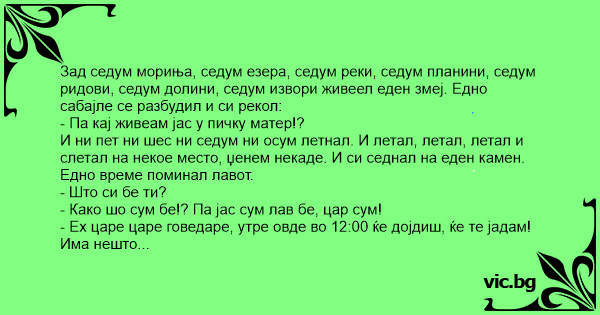 Зад седум мориња, седум езера, седум реки, седум планини, седум ридови, седум долини, седум извори живеел еден змеј. Едно сабајле се разбудил и си рекол: