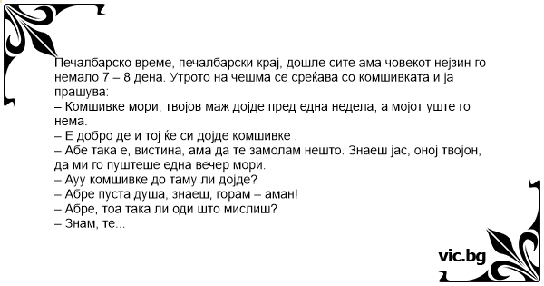 – Комшивке мори, твојов маж дојде пред една недела, а мојот уште го нема.