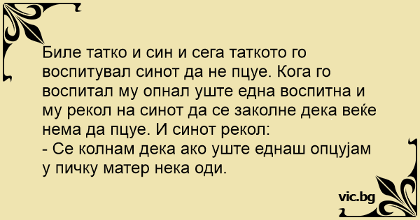 Биле татко и син и сега таткото го воспитувал синот да не пцуе. Кога го воспитал му опнал уште една воспитна и му рекол на синот да се заколне дека веќе нема да пцуе. И синот рекол: - Се колнам дека ако уште еднаш опцујам у пичку матер нека оди.