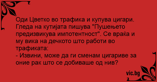 Оди Цветко во трафика и купува цигари. Гледа на кутијата пишува "Пушењето предизвикува импотентност". Се враќа и му вика на дечкото што работи во трафиката: