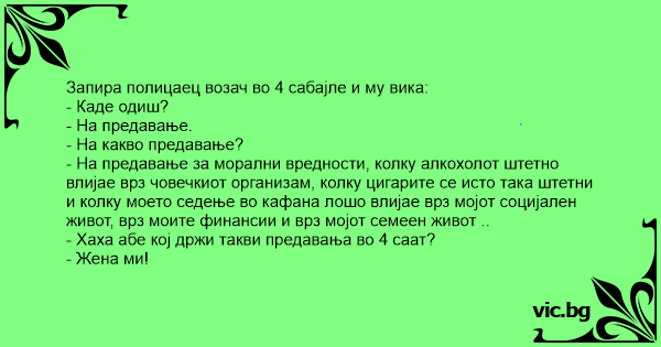 Полицаец застанува пијан маж и го прашува: - Каде сте тргнале толку доцна навечер? - На предавање. - Е како да не. Кој држи предавања во ова време?! - Жена ми!!