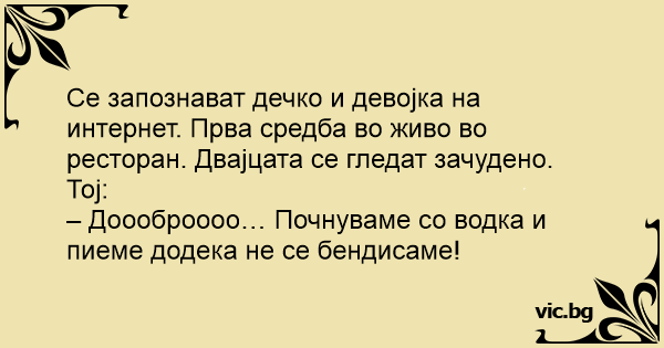 Се запознават дечко и девојка на интернет. Прва средба во живо во ресторан. Двајцата се гледат зачудено.