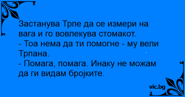 Дебелиот маж што правел финта на вагата Мъж се качва на кантара да се премери и си гълта корема. Жена мy: Жена наблюдава пълния си мъж, който е стъпил на домашния кантар и с ръце притиска корема си навътре. И му казва ехидно: Дружина заходить до ванної кімнати і бачить: на вагах стоїть чоловік і втягує живіт. – Думаєш, це допоможе? – єхидно запитує вона. – Звичайно! Як я інакше побачу цифри? Une femme remarque son mari dans la salle de bain. Il est debout sur la balance en train de se peser et tente tant bien que mal de rentrer son ventre le plus possible. Elle lui dit: - Même si tu essaies de rentrer ton ventre, je ne pense pas que ça t'aide en quoi que ce soit ! Le mari répond : -... A woman noticed her husband standing on the bathroom scale, sucking in his stomach. "Ha­­! That's not going to help," she said. "Sure, it does," he said. "It's the only way I can see the numbers." Une femme entre dans sa salle de bain et voit son mari tout nu, en train de se peser, tout en rentrant son ventre. Elle se marre et lui dit : - Tu sais, tu as beau rentrer ton bide, ça ne fera pas... Трпе застанал на вагата да си ги мери килограмите, и почнал со рацете да го притиска стомакот навнатре. Трпана го гледа, му се смее и му вели: - Тоа нема да ти помогне да станеш полесен. - Да, но... A férj áll a fürdőszobamérlegen, és a hasát próbálja meg behúzni. - Nem hiszem, hogy ez segítene a súlyodon - mondja neki a felesége. - Dehogynem, mert így legalább látom a számokat! Behúzott hassal állok a mérlegen. Meglátja a feleségem: - Így nem fog ám kevesebbet mutatni! - Tudom drágám, de legalább így látom a számokat! A hasát behúzva áll a pasi a fürdőszobamérlegen. A felesége gúnyosan odaszól neki: - Drágám, szerintem nem sokat segít, ha behúzod a hasad! Mire a férj: - Dehogynem! Így legalább látom a számokat! Une femme à son mari : - Qu’est-ce que tu fais ? - Tu le vois bien, je me pèse. - Tu devrais rentrer ton ventre. - Idiote, ce serait pareil. - Oui, mais tu verrais les chiffres de la balance. A wife saw her husband weight himself on the scale trying to pull in the stomach. The wife thought he was trying to reduce his weight on the scale. So she said, "You know, I don't think that will... A man is standing on the bathroom scales desperately sucking in his stomach. “That’s not going to help,” says his wife. “Yes,it will,” replies the man. “It’s the only way I can see the fucking... Far står på badevægten og lille hans kommer ind: - Far, jeg tror altså ikke, det hjælper at stå og trække maven Ind sådan der. - Jo, for ellers kan jeg ikke se tallene. Įeina žmona į kambarį, žiūri – vyras ant svarstyklių stovi ir bando pilvą įtraukti. - Nemanau, kad tau tai padės… - Aišku, padės, o kaip kitaip skaičius pamatysiu? Nusprendė namuose vyriškis pasisverti. Atsistojo ant svarstyklių, pilvą įtraukė ir sveriasi. Žmona iš virtuvės žiūri ir mąsto: tokį pilvą užsiaugino, o sverdamasis įtraukė – galima pagalvoti, kad...