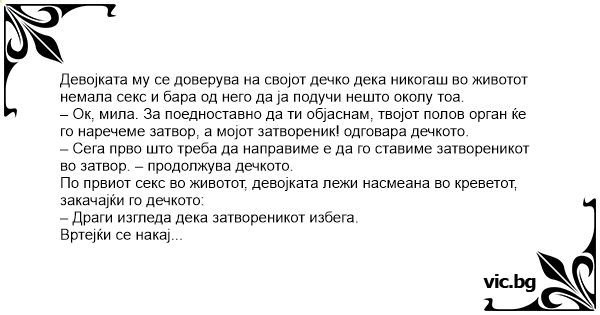 Девојката му се доверува на својот дечко дека никогаш во животот немала cekc и бара од него да ја подучи нешто околу тоа. – Ок, мила. За поедноставно да ти објаснам, твојот полов орган ќе го наречеме затвор, а мојот затвореник! одговара дечкото. – Сега прво што треба да направиме е да го ставиме затвореникот во затвор. – продолжува дечкото. По првиот cekc во животот, девојката лежи насмеана во креветот, закачајќи го дечкото: – Драги изгледа дека затвореникот избега. Вртејќи се накај нејзе насмеан, одговара: – Тогаш ќе мора да го вратиме повторно во затвор. По завршувањето на вториот пат, дечкото полн со себе пали цигара, кога девојката пресреќна со новото искуство повторно му се жали: – Мило, затвореникот повторно избега. Дечкото со последни сили повторно се издига на ниво на задачата. По ова целосно исцрпен легнува на креветот, кога девојка му пак го подбуцнува: – Драги… Затвореникот… Повторно избега. Уморно вртејќи се накај нејзе, одеднаш и се развикува: – АЛО БРЕ, ПА НЕ Е ОН НА ДОЖИВОТНА РОБИЈА!!! ЈАСНО!!!
