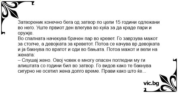 – Слушај жено. Овој човек е многу опасен погледни му ги алиштата со години бил во затвор. Го видов како те бакнува сигурно не осетил жена долго време. Прави како што ќе ти каже и ако бара cekc не се противречи оти ќе не убие. Издржи душо, те сакам!