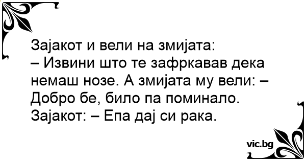 – Извини што те зафркавав дека немаш нозе. А змијата му вели: – Добро бе, било па поминало. Зајакот: – Епа дај си рака.