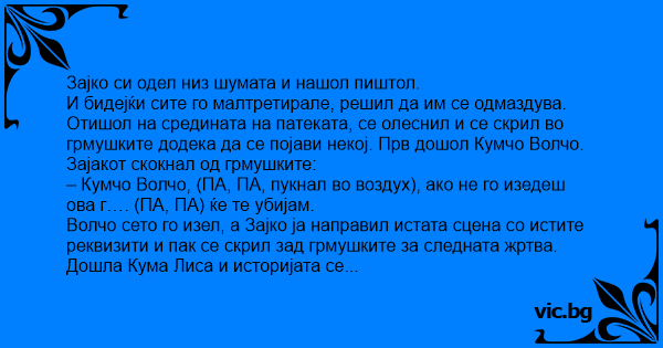 – Кумчо Волчо, (ПА, ПА, пукнал во воздух), ако не го изедеш ова г…. (ПА, ПА) ќе те убијам.