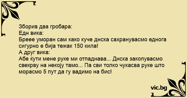 Абе ќути мене руке ми отпаднава... Днска закопувасмо свекрву на некоју тамо... Па сви толко чукасва руке што морасмо 5 пут да гу вадимо на бис!