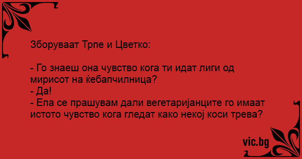 - Го знаеш она чувство кога ти идат лиги од мирисот на ќебапчилница? - Да! - Епа се прашувам дали вегетаријанците го имаат истото чувство кога гледат како некој коси трева?