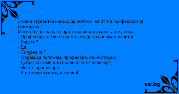 Сé Alles für das Examen Студентка влиза в кабинета на млад преподавател, разкопчава няколко копчета на ризата си и коленичи: A student comes to a young professor's office hours. Um professor está trabalhando em seu escritório durante o horário de funcionamento. Een super mooie 20 jarige studente loopt het kantoortje in van een jonge en knappe professor. Ze gluurt even de gang in, doet de deur op slot en gaat smekend op haar knieën. Met een zachte en... En ung, söt universitetsstudent gick ner till sin lärares rum efter en lektion. Hon tittade runt i korridoren, smet snabbt in, stängde dörren och ställde sig på knä framför honom. - Jag gör vad... A garota muito bonita, vestindo uma saia minúscula e um mini blusa decotadíssima, chega para o professor de matemática reclamando que precisa tirar a nota máxima no exame para poder passar. —... Ik heb er alles voor over om een goed cijfer voor dit tentamen te halen,” verklaarde een studente tegen haar professor. Ze boog zich naar hem over en staarde hem aan. “Ik wil er werkelijk alles... Studio del professore universitario. E' orario di ricevimento degli studenti. Bussano alla porta ed entra una stupenda bionda, alta, con tacchia alti, minigonna vertiginosa e maglietta aderente.... Η όμορφη φοιτήτρια μπαίνει στο γραφείο του καθηγητή. Βεβαιώνεται πρώτα ότι Δεν είναι κανείς στο διάδρομο και κλείνει πίσω της την πόρτα. Πλησιάζει Τον καθηγητή και, χωρίς πολλές περιστροφές, του... Atraktivní studentka přijde před zkouškou k profesorovi. Posadí se, poodhrne sukni a řekne: „Udělala bych cokoliv, abych zítra tu zkoušku udělala.” Profesor vytáhne obočí: „Cokoliv?” Studentka si... — Професоре, ви повірите мені, я готова все зробити, щоби скласти цей іспит? Я маю на увазі абсолютно все! Професор уточнює: — Таки справді все? Вона нахиляється, показуючи грудь у декольте,... Zgodna studentkinja nikako da položi ispit pa je profesor malo kritikuje. Ona, svesna svoje lepote i šarma, reče: • Profesore, sve ću učiniti da položim ispit! • Baš sve? • Baš sve! • Jesi li...