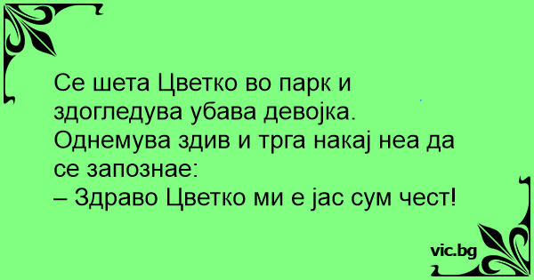 Се шета Цветко во парк и здогледува убава девојка. Однемува здив и трга накај неа да се запознае: – Здраво Цветко ми е јас сум чест!