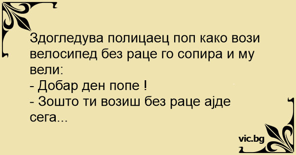 Здогледува полицаец поп како вози велосипед без раце го сопира и му вели: