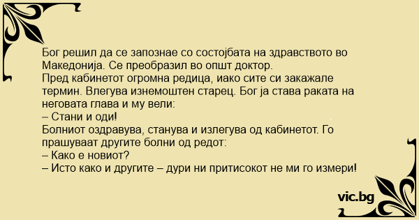 Бог решил да се запознае со состојбата на здравството во Македонија. Се преобразил во општ доктор.
