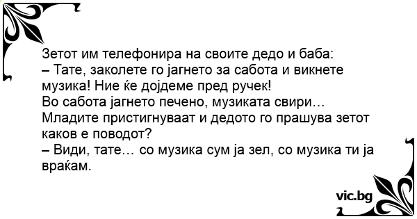 – Тате, заколете го јагнето за сабота и викнете музика! Ние ќе дојдеме пред ручек!