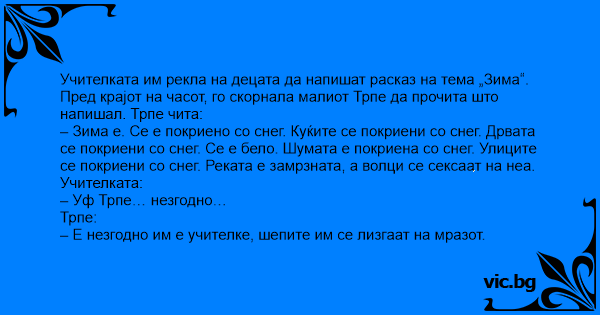 Учителката им рекла на децата да напишат расказ на тема „Зима“. Пред крајот на часот, го скорнала малиот Трпе да прочита што напишал. Трпе чита: