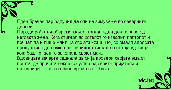 Поради работни обврски, мажот тргнал еден ден порано од неговата жена. Кога стигнал во хотелот го извадил лаптопот и почнал да и пише маил на својата жена. Но, во емаил адресата пропуштил една буква па емаилот стигнал до некоја вдовица која баш тој ден го закопала својот маж.