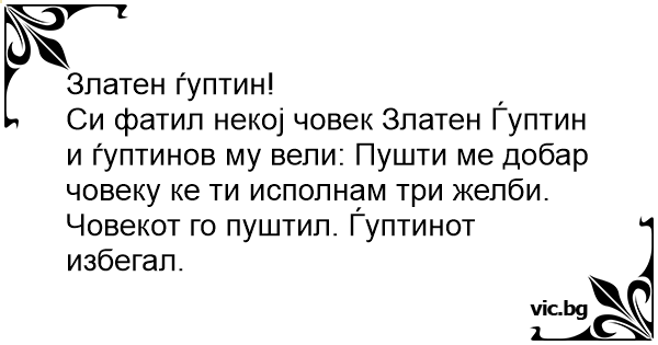 Си фатил некој човек Златен Ѓуптин и ѓуптинов му вели: Пушти ме добар човеку ке ти исполнам три желби. Човекот го пуштил. Ѓуптинот избегал.