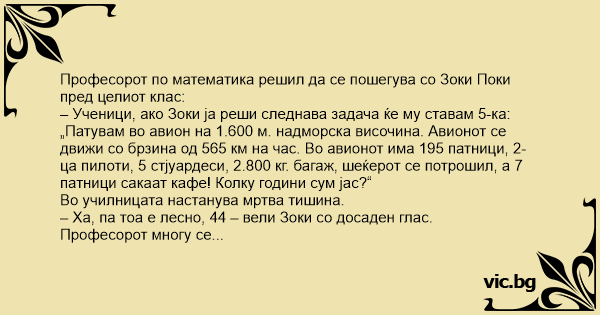 – Ученици, ако Зоки ја реши следнава задача ќе му ставам 5-ка: