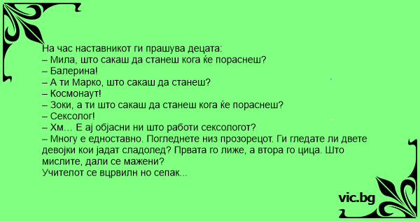 – Многу е едноставно. Погледнете низ прозорецот. Ги гледате ли двете девојки кои јадат сладолед? Првата го лиже, а втора го цицa. Што мислите, дали се мажени?