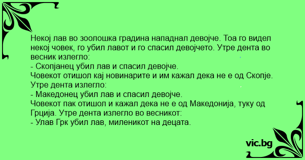 Некој лав во зоолошка градина нападнал девојче. Тоа го видел некој човек, го убил лавот и го спасил девојчето. Утре дента во весник излегло: