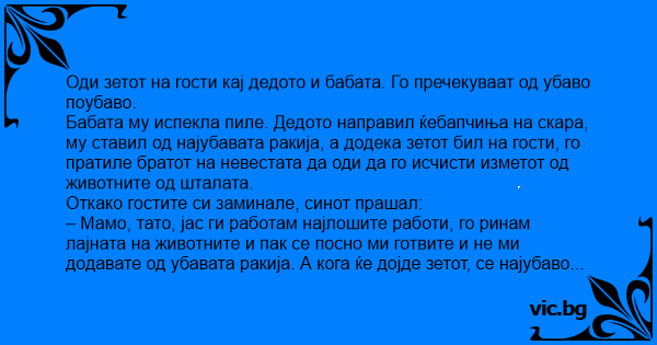 – Мамо, тато, јас ги работам најлошите работи, го ринам лајната на животните и пак се посно ми готвите и не ми додавате од убавата ракија. А кога ќе дојде зетот, се најубаво за него.