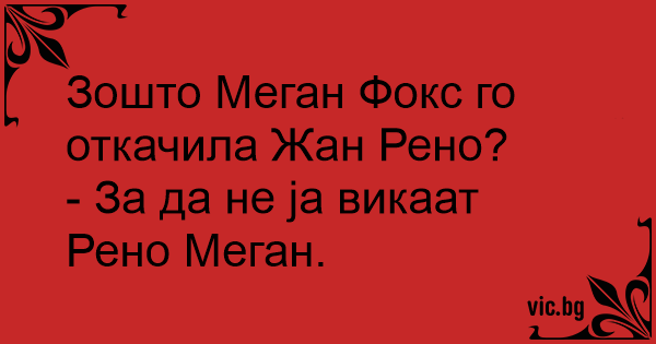 Разбра се защо навремето се развали годежът между Жан Рено и Меган Фокс. Булката изведнъж осъзнала, че след сватбата ще стане Рено Меган.