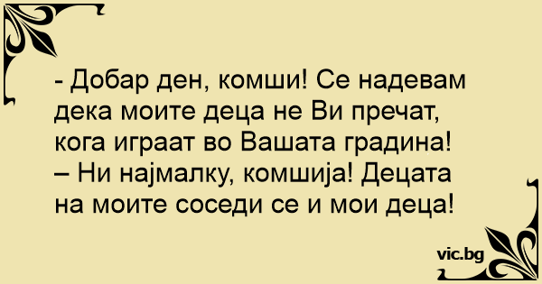 - Комши, надявам се не ти пречи, че децата ми играят в твоята градина?