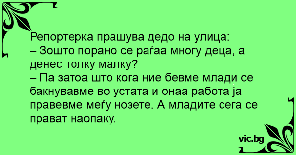– Па затоа што кога ние бевме млади се бакнувавме во устата и онаа работа ја правевме меѓу нозете. А младите сега се прават наопаку.