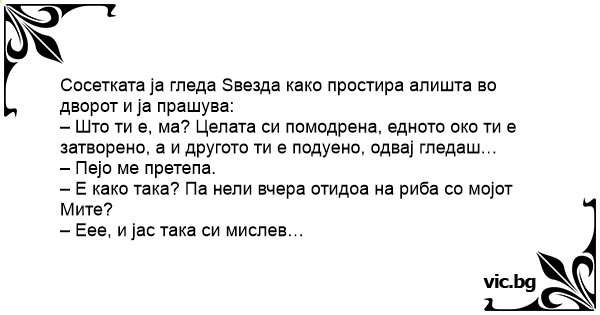 Модрица Schwer verletzt zum Arzt молодая жена в слезах прибегает к матери. - что случилось? - меня... Жена идва на работа със синьо око. Плачеща жена звъни на вратата на майка си: Една жена доаѓа да работа со сино око. Нејзиниот колега забележува и ја прашува: - Une femme arrive chez son médecin, elle a des dents cassées, le nez en sang, et le visage tuméfié. Hubert till Mats: - Vilken blåtira du har. Vad är det som har hänt? - Jag fick den av frugan. - Jag trodde att hon var bortrest? - Det trodde jag med... Een vrouw komt bij de dokter, met gebroken tanden, de nek vol bloed en een blauw gezicht. Vraagt de dokter: Wie heeft je dat aangedaan? Antwoordt het vrouwtje: Het komt van mijn echtgenoot! Hoezo,... Een jonge vrouw komt met een blauw oog bij haar moeder. "Wie heeft dat nou toch gedaan?" " "Ja, mijn man." "Ik dacht dat die in Londen zat?" "Dat dacht ik ook…" Terezinha encontra a vizinha de olho roxo,um hematoma enorme do lado direito do rosto e pergunta: — Credo,Verônica!Que foi que aconteceu? — Foi o cavalo do meu marido... — O Sergio? Mas eu pensei... Genc bir kadin sol gozu mosmor bir halde evine gelmis. - Aman allahim kim yapti bunu kizim? - Kocam. - Peki ama o londra da degil miydi? - Bende oyle zannediyordum anne. Proaspăt căsătorită, o fată se plânge mamei că soţul i-a făcut o vânătaie sub ochi. - Sunt surprinsă! Eu îl credeam plecat în delegaţie, spune mama. - Şi eu!