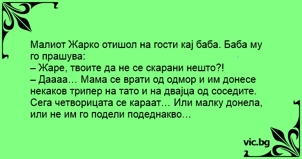 – Даааа… Мама се врати од одмор и им донесе некаков трипер на тато и на двајца од соседите. Сега четворицата се караат… Или малку донела, или не им го подели подеднакво…