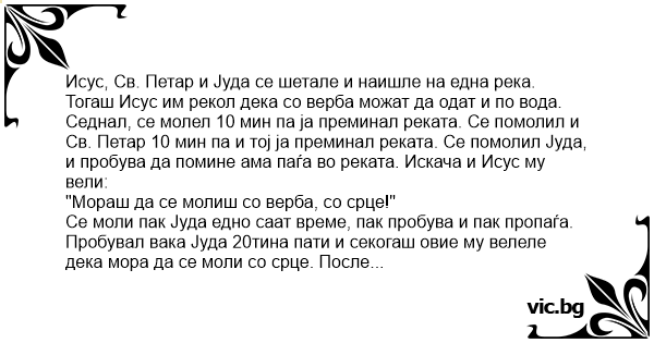 Проваѓав реку Исус, Папа и Чак Норис. Прв иде Исус, и корак по корак он пројде. После њега иде Чак Норис. И он проваѓа без проблем. Поваѓа Папа и на прв корак он падне у воду! Гледав га Исус и Чак,...