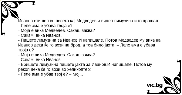 -Наша е вика Иванов. – Сакаш ваква? – му вика Медведев.Иванов се мисли и си вика во себе “Да изгубам хелихоптер за една женска” и вика: