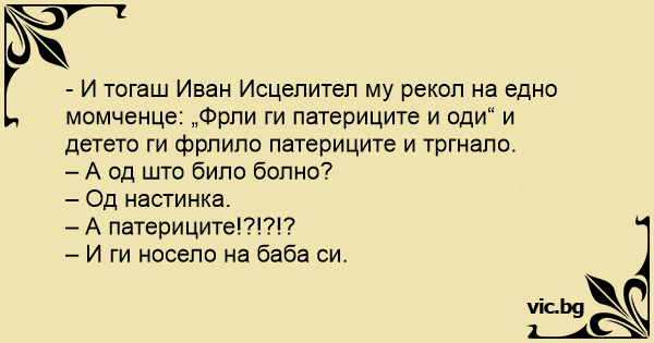 - И тогаш Иван Исцелител му рекол на едно момченце: „Фрли ги патериците и оди“ и детето ги фрлило патериците и тргнало.