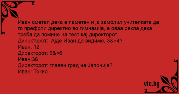 Иван сметал дека е паметен и ја замолил учителката да го префрли директно во гимназија, а оваа рекла дека треба да помине на тест кај директорот.