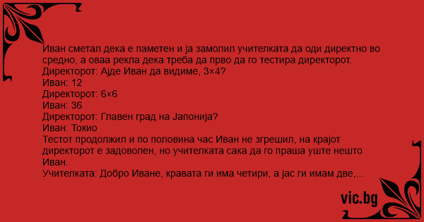 Иван сметал дека е паметен и ја замолил учителката да оди директно во средно, а оваа рекла дека треба да прво да го тестира директорот.