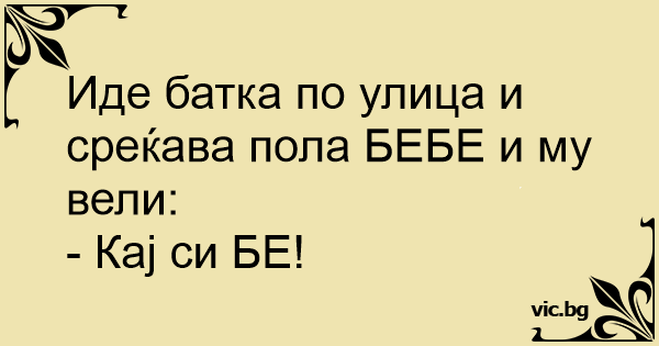 Иде батка по улица и среќава пола БЕБЕ и му вели: