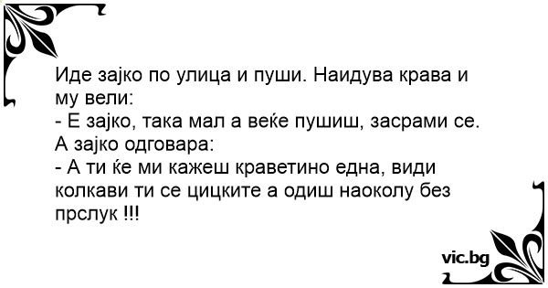 Иде зајко по улица и пуши. Наидува крава и му вели: