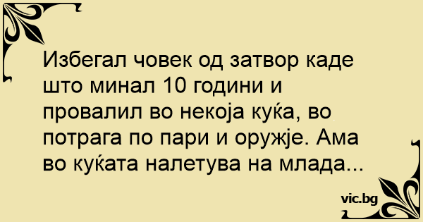 Избегал човек од затвор каде што минал 10 години и провалил во некоја куќа, во потрага по пари и оружје. Ама во куќата налетува на млада...