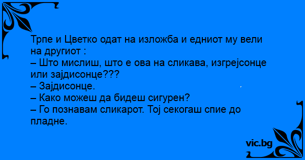 Трпе и Цветко одат на изложба и едниот му вели на другиот :