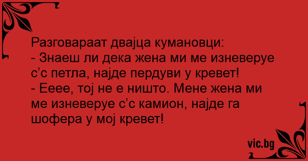 - Ееее, тој не е ништо. Мене жена ми ме изневеруе с’с камион, најде га шофера у мој кревет!