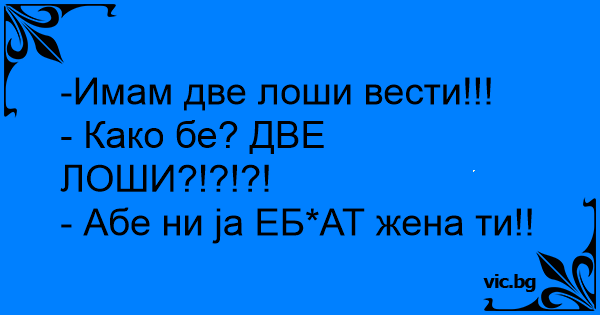 Пешо: - Кире, лоша новина имам, жена ти ни изневерява...