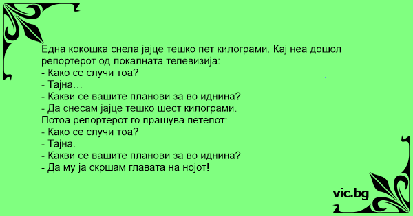 O gaina produce un ou de juma' de kil. Presa, televiziuni, interviuri, toti pe gaina: - Cum ati reusit performanta? - Secret de familie. - Planuri de viitor? - Sa fac un ou de un kil. Il iau in...