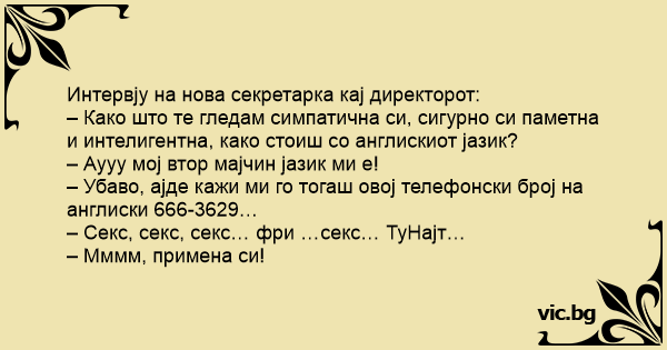 – Како што те гледам симпатична си, сигурно си паметна и интелигентна, како стоиш со англискиот јазик?
