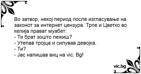 Во затвор, некој период после изгласување на законот за интернет цензура. Трпе и Цветко во келија прават муабет:
