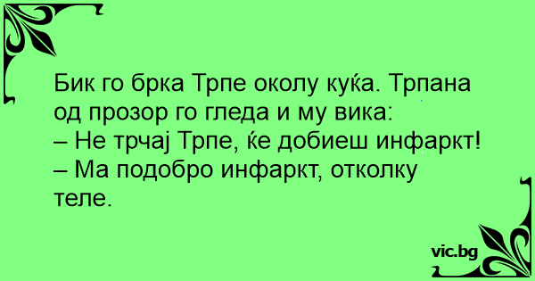 – Не трчај Трпе, ќе добиеш инфаркт!