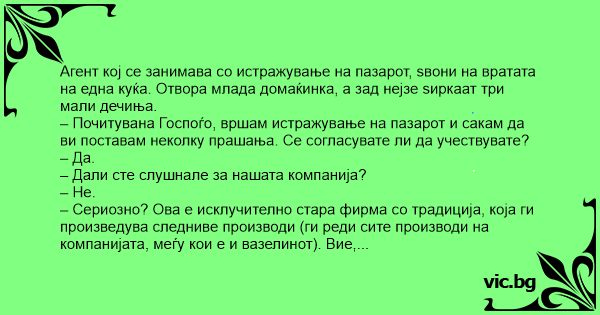 Агент кој се занимава со истражување на пазарот, ѕвони на вратата на една куќа. Отвора млада домаќинка, а зад нејзе ѕиркаат три мали дечиња.