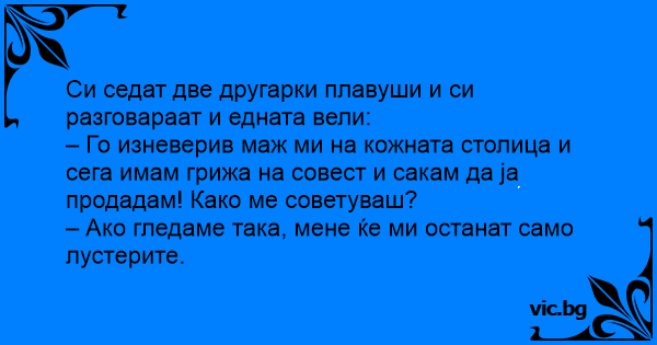 Си седат две другарки плавуши и си разговараат и едната вели: